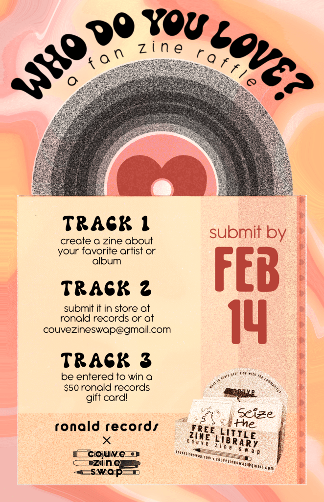 We’re collaborating with one of our distro locations, Ronald Records, to do a fan zine raffle! From now until Valentine’s Day, folks can make and submit zines about their favorite artists and albums to be entered to win a $50 Ronald Records gift certificate. After the raffle, the zines will be paired with albums at the store.